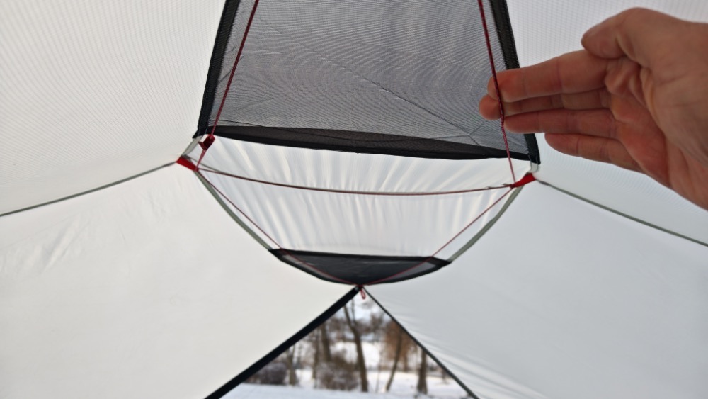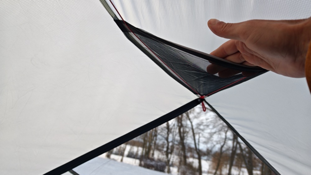 Ten namiot jest bardzo łatwo przewietrzyć. W szczytach konstrukcji umieszczone są dwa ogromne wywietrzniki którem możemy otworzyć lub zamknąć (tylko z zewnątrz) w zależności od potrzeby. Blokowane są sztywnym patyczkiem na rzep velcro co pozwala zabezpieczyć je przed zamknięciem np. przez silny napór wiatru.