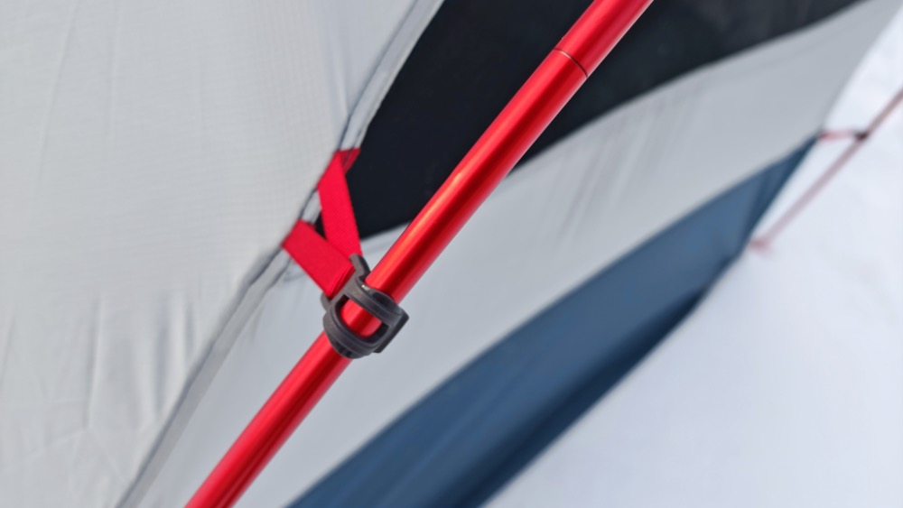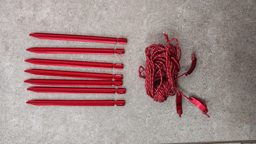 Cały namiot ma 8 lekkich trójlistnych śledzi MSR Mini Groundhog (15 cm długości i 10 g wagi każdy). 4 śledzie są potrzebne do przymocowania do ziemi rogów sypialni, 2 śledzie na przedsionki i 2 na odciągnięcie naciągów na ścianach szczytowych. Zaledwie 8 śledzi wystarczy do solidnego postawienia tego namiotu.