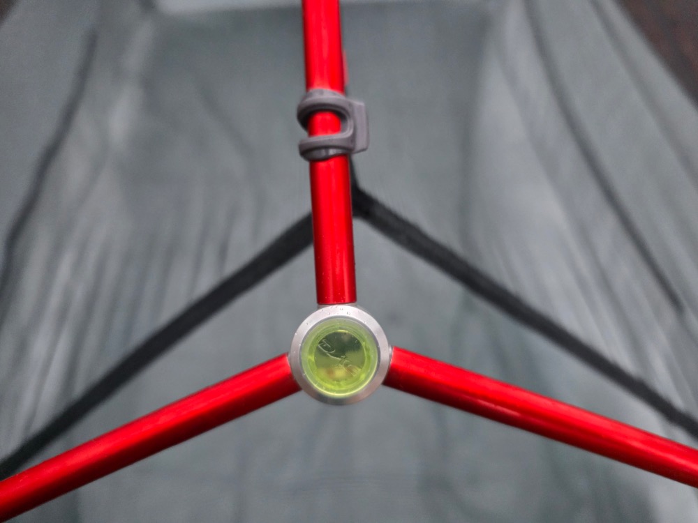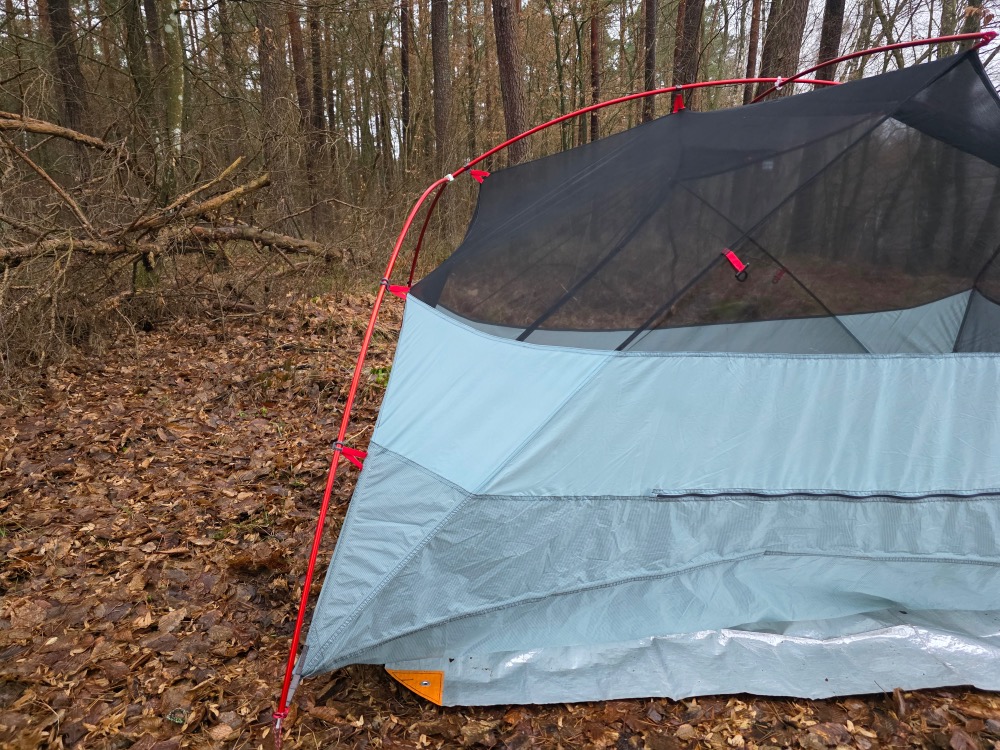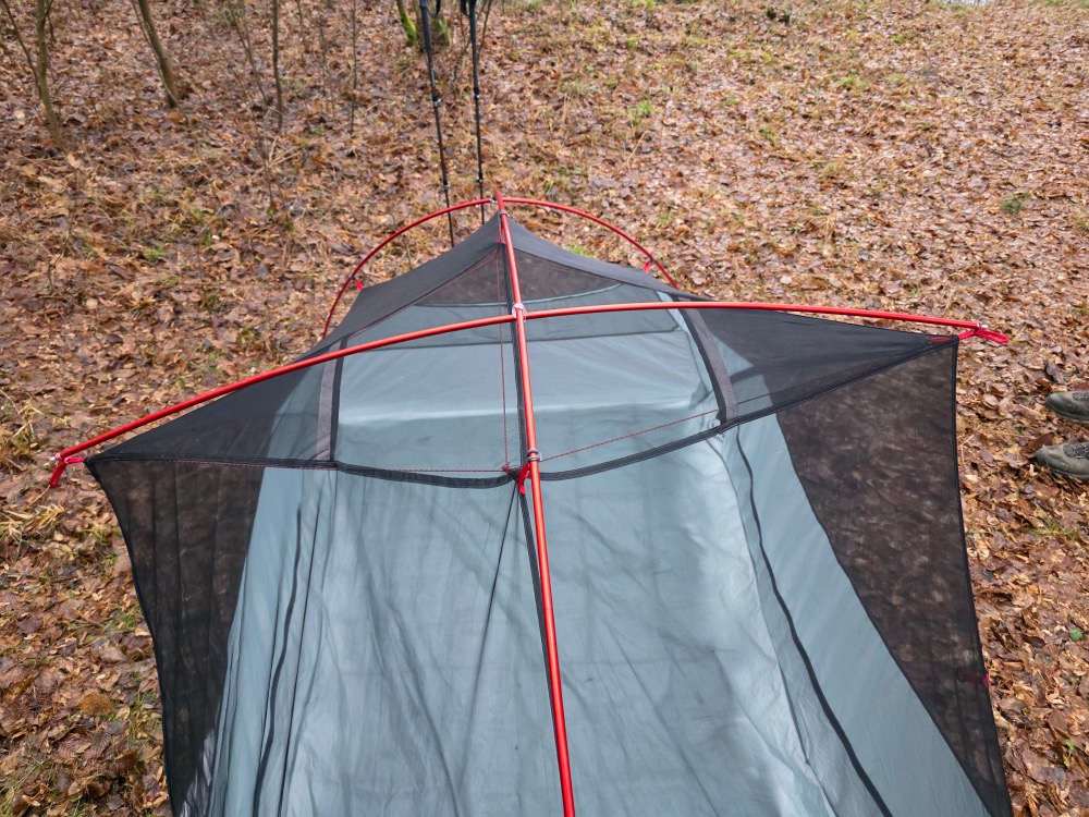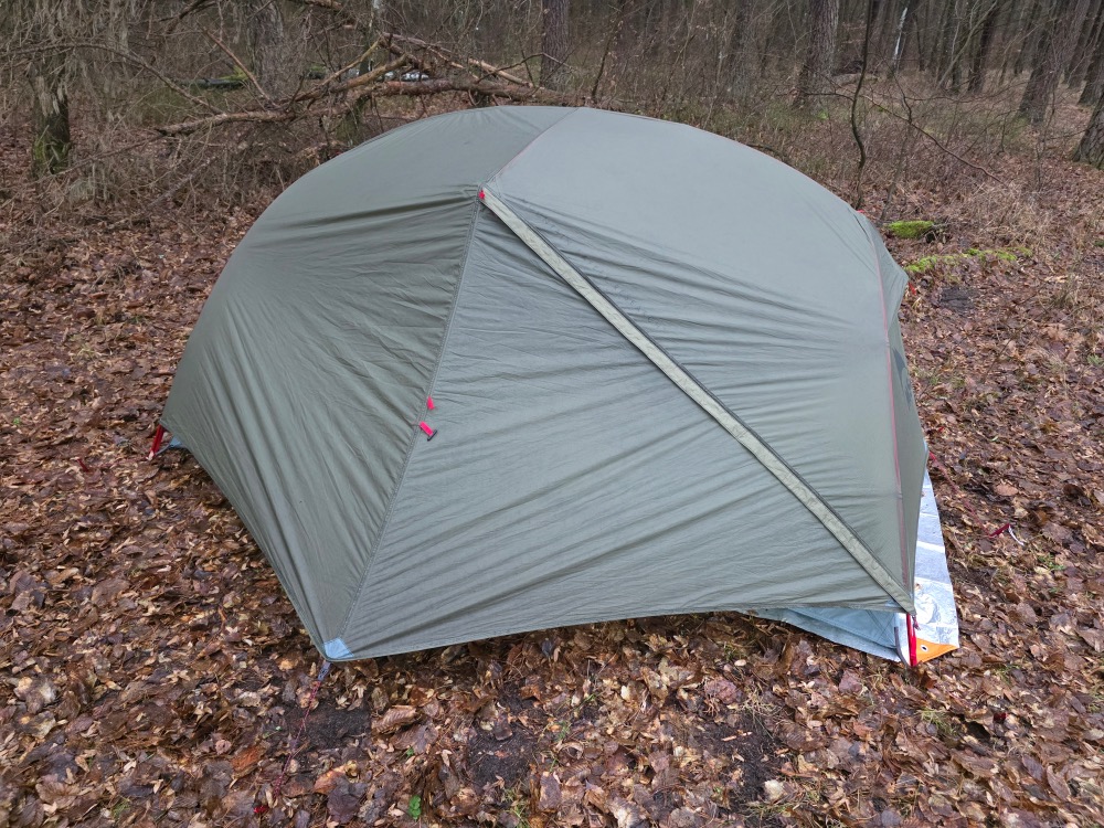 To co się bardzo zmieniło to bryła jaką wyznacza maszt. Potężne maszty DAC z trójkątnymi łącznikami na szczytach sypialni tworzą mocną klatkę. Ale to co robi prawdziwą różnicę to niepozorny pałąk w poprzek sypialni. W obecnym modelu jest on sporo szerszy i wysunięty na boki co nie tylko zwiększa objętość sypialni ale także powiększa znacznie przedsionki oraz wygodę wchodzenia i wychodzenia. Zakładając buty czy dłubiąc coś przy bagażu w tym namiocie mamy nad głową znacznie więcej miejsca. Maszt z woreczkiem waży około 450 gram a sypialnia 528 gram. Masz ma 50 cm długości a w worku tworzy dosyć gruby pęczek, w obwodzie przypominający rękę w nadgarstku.