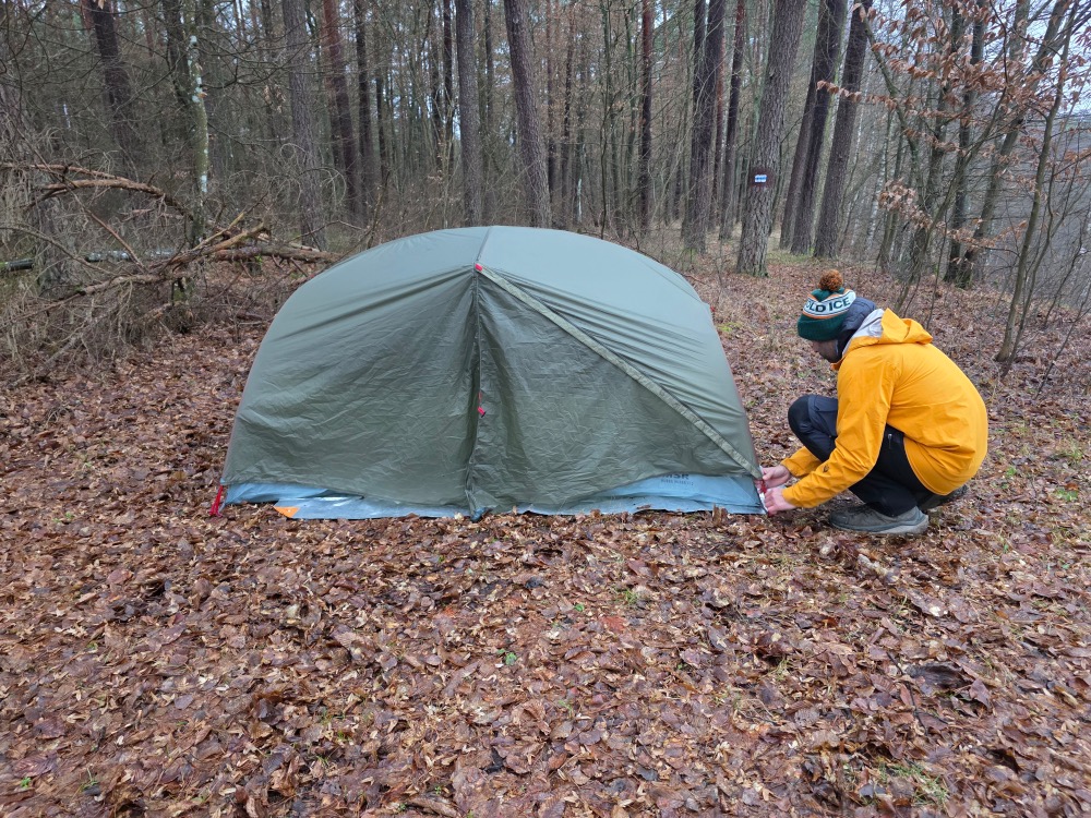 Sypialnię odciąga się i montuje do ziemi przy pomocy 4 śledzi. Maszty osadza się w aluminiowych płytkach co zasługuje na szczególną pochwałę. Ten namiot nie ma żadnych plastikowych klamerek na które moglibyśmy nadepnąć i je połamać! Do tych aluminiowych płytek podpina się także tropik.