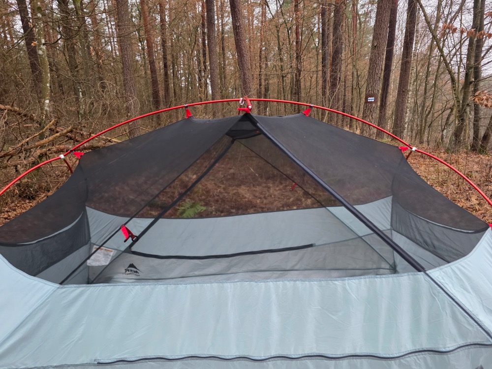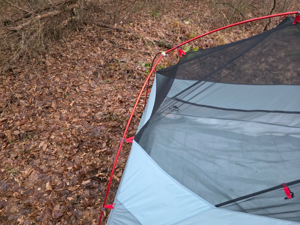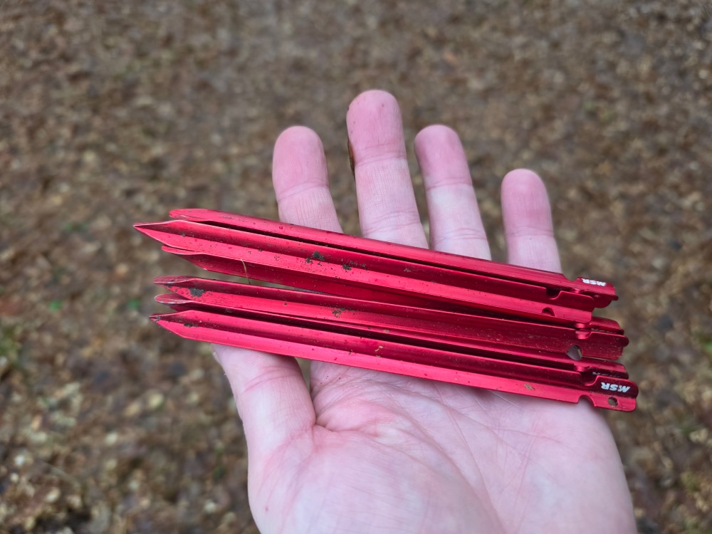 Cały namiot ma 8 lekkich trójlistnych śledzi MSR Mini Groundhog (15 cm długości i 10 g wagi każdy). 4 śledzie są potrzebne do przymocowania do ziemi rogów sypialni, 2 śledzie na przedsionki i 2 na odciągnięcie naciągów na ścianach szczytowych. Zaledwie 8 śledzi wystarczy do solidnego postawienia tego namiotu.