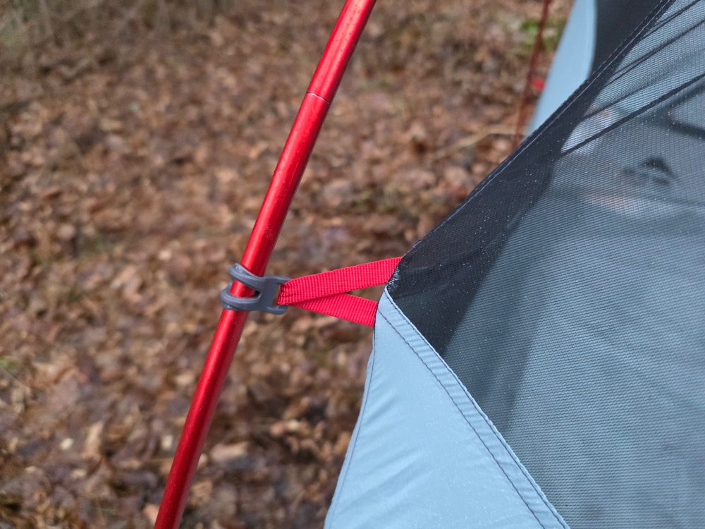 W namiocie Hubba Hubba LT 2 zamki są proste. Dwa zamki jeden poziomo przy gruncie oraz drugi ukośnie od sufitu do boku pozwalają na wygodne wchodzenie i wychodzenie. Zamki w kształcie C czy D mające zamki pod kątem mogły się psuć czy zacinać, tutaj nie ma z tym problemu. Po otwarciu zarówno sypialni jak i tropiku zwisający materiał możemy zrolować i przypiąć za pomocą specjalnych pętelek tak aby nie przeszkadzał. Wejścia do namiotu z zewnątrz w przedsionku to tylko jeden prosty zamek od szczytu na środku do boku na dole. Zamek ten jest przykryty patką i zabezpieczony przed deszczem (rynienki StayDry).