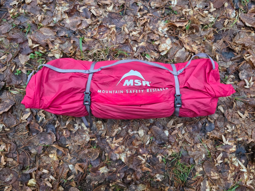 MSR Hubba Hubba LT 2 pakuje się do szeroko otwieranego worka zamykanego przez zrolowanie. Nie ma tu żadnych ściągaczy czy sznurków ze stoperem. Worek ma wszyte mocne taśmy pozwalające przytroczyć namiot do plecaka czy roweru. Worek na namiot waży 78 g.