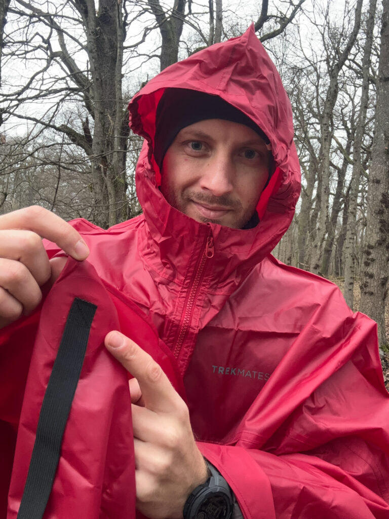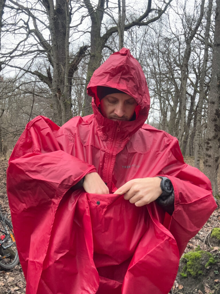 Kolejny jej atut to możliwość zmieszczenia pod nią małego plecaka. Bez kombinowania, bez rozciągania materiału. I coś, czego brakowało mi w większości poncho, jakie miałem do tej pory, a mianowicie duża kieszeń na piersi. Genialna rzecz. Mapa, telefon, przekąski są ciągle pod ręką, bez konieczności zaglądania do plecaka czy kieszeni.